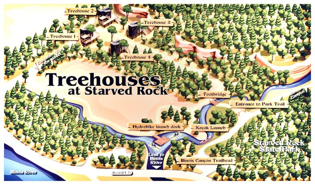 Luxury treehouse in a resort with 1 other treehouse completed and 2 more being finished up with interior finishes on 26 acres carved into the edge of Starved Rock State Park 90 mins from Chicago. More units to come.